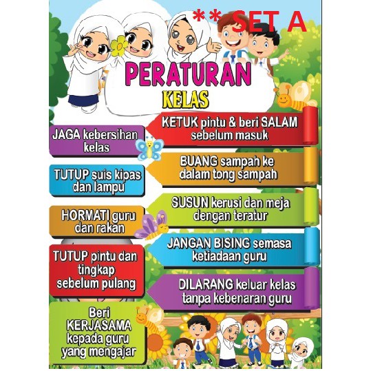 Padankan gambar di bawah dengan jawapan yang betul. Peraturan di dalam kelas, contoh tata tertib kelas, membuat peraturan kelas, peraturan kelas sekolah dasar, aturan kelas keren, menempatkan aturan kelas.